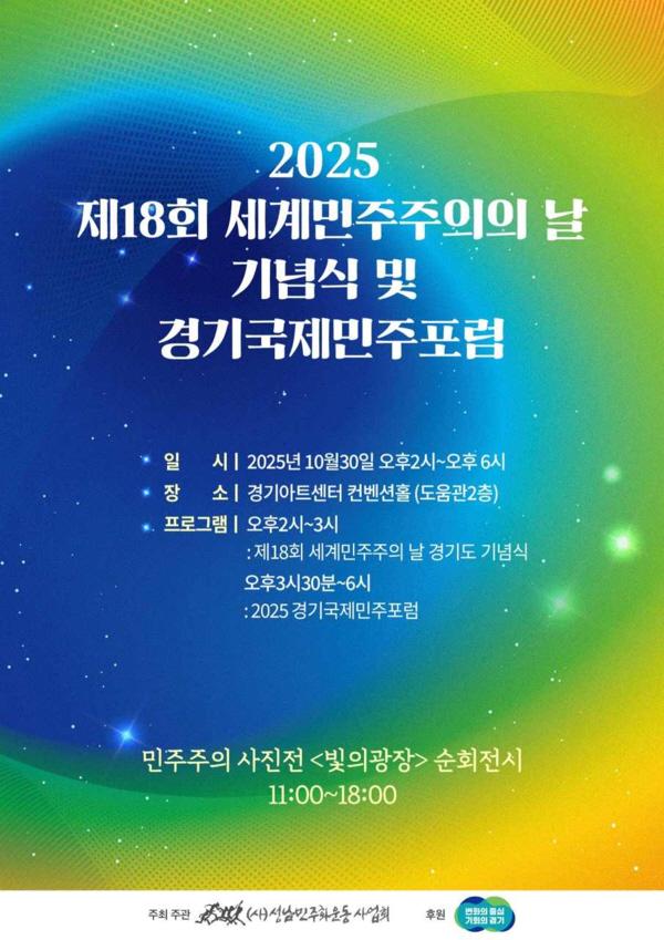 10월 30일 세계민주주의의 날을 기념하여 ‘경기국제민주포럼’이 열린다. 제18회 세계민주주의 날 기념 ‘2025 경기 국제민주포럼’이 10월 30일 오후 2시부터 경기아트센터 컨벤션홀에서 열린다.