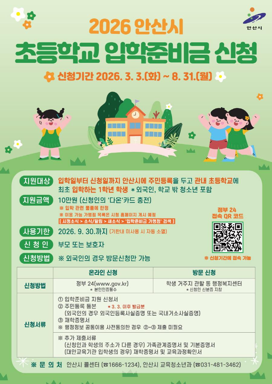 안산시, 초등학교 입학준비금 신청 접수… 교육복지 강화