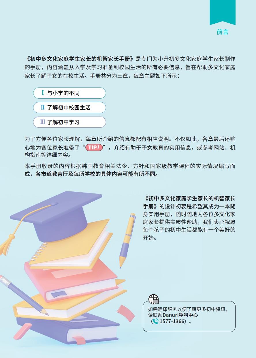《初中多文化家庭学生家长的机智家长手册》是专门为小升初多文化家庭学生家长制作 的手册,内容涵盖从入学及学习准备到校园生活的所有必要信息,旨在帮助多文化家庭 家长了解子女的在校生活。