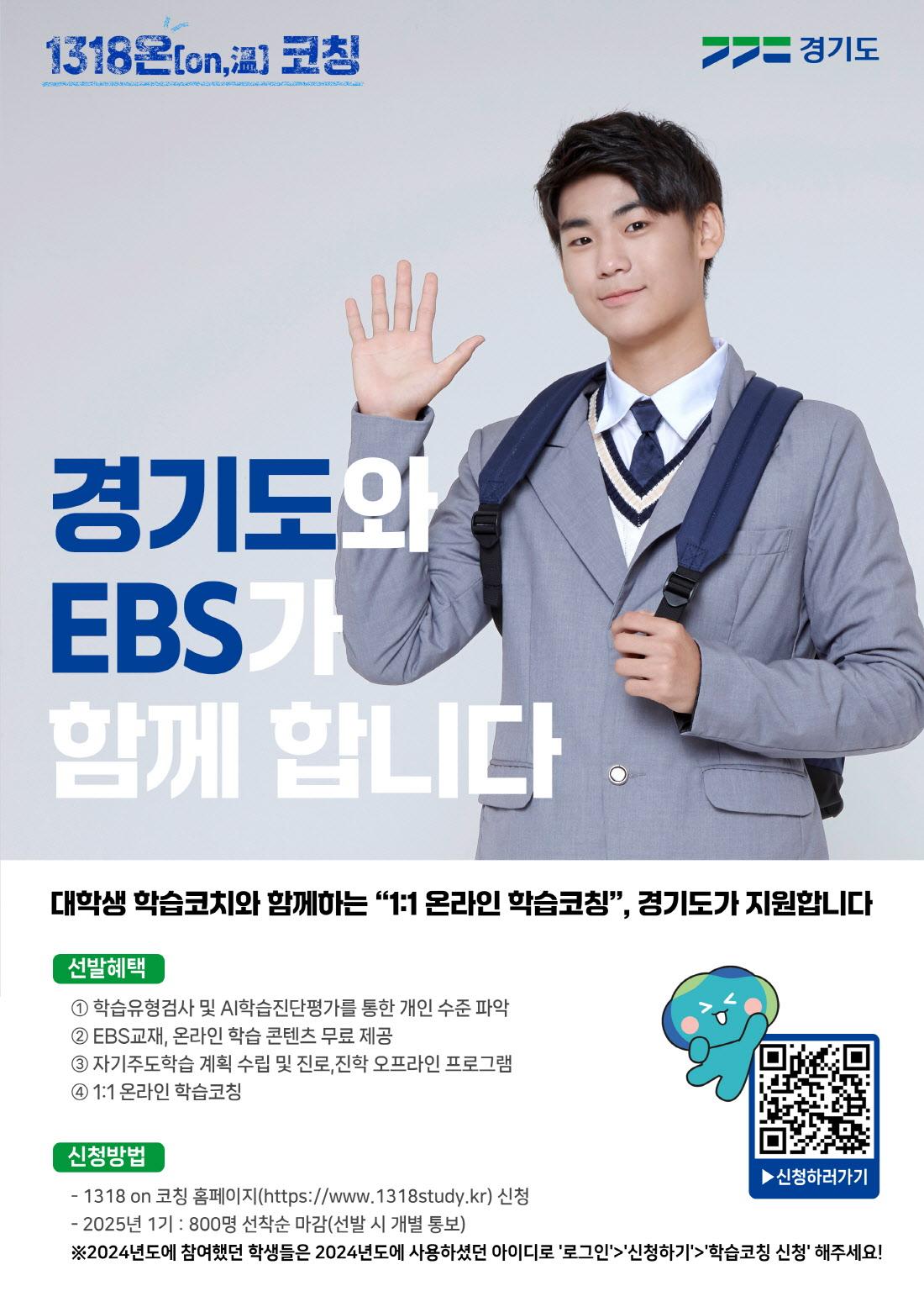 학습코치는 경기도와 EBS가 선별한 우수 학습코치로 배정된다. 또한 참여 학생들에게는 대학 탐방, 집중학습 진로성장캠프 등 다양한 학습 경험의 기회도 제공된다. 참여를 희망하는 청소년은 ‘1318온코칭’ 누리집(1318study.kr)에서 신청할 수 있다.