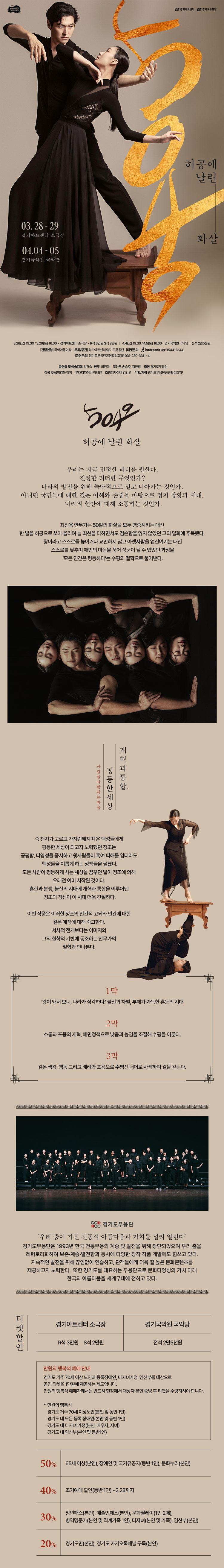 경기아트센터와 경기도무용단은 올해 첫 기획공연으로 ‘5049 : 허공에 날린 화살’을 3월 28일을부터 29일까지 경기아트센터 소극장에서, 4월 4일부터 5일까지는 경기국악원 국악당에서 선보여요.